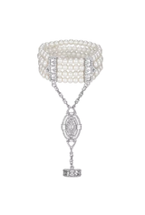 A stunning Gatsby-inspired bracelet! Features include decadent rows of pearls, rhinestone and silver-tone filigree work.