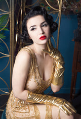 The mesh gowns also have around 2 inches of extra stretch. For a classic, loose 1920's look....please size up. For a form-fitting look....please size down.