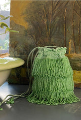 Our Bonbon Pochette is a love letter to craftsmanship—woven on a crochet base and adorned with cascading tiers of looped fringe. Lined in soft satin and finished with silk corded straps, each piece is finished with delicate beaded accents ~ pure vintage romance.