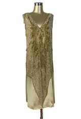 Constructed on evening quality mesh, the gown is handbeaded with sparkling gold beads and sequins. A spectacular deco floral design adorns the main panel. Open above the hipline.....beaded draping on the shoulder and hip.