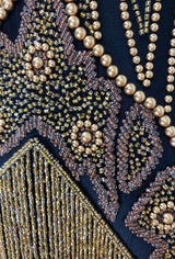 Covered in decadent black jet beadwork, the gown features a classic 1920's deco design and three layers of beaded fringe. A low vneck front and back takes this gown to the next level in glamour.