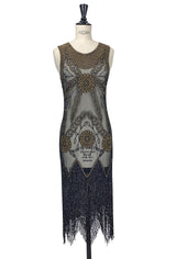 Inspired by the spirited dance that gives it its name, the Lindy Gown balances effortless elegance with a touch of playful allure. Hand-beaded on luxurious rayon mesh, the design features classic Art Deco motifs accented with rich amber and jet glass beads.