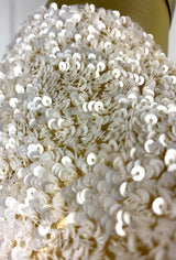 Handcrafted on nude mesh, this capelet is loaded with clusters of mother-of-pearl sequins. Two beautiful beaded ties complete the look.