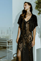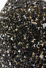 Handcrafted on black mesh, this capelet is loaded with clusters of black jet sequins. Two beautiful beaded ties complete the look.