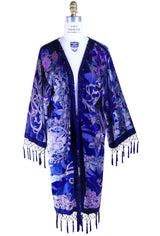 Made of beautiful burnout velvet devore on a sheer rayon background, the robe is cut kimono-style with beaded fringe down the front, at the hem, and under the arms.