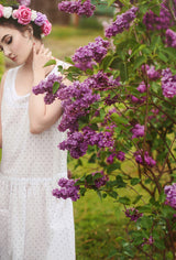 Made of 100% Indian cotton in a reproduction 1930's vintage print, the dress features a rounded neckline, banded/gathered drop waist, side snaps, and a beautiful antique lace trim.
