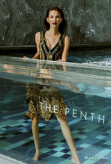 Incorporating iconic Art Deco designs, the our Paris Deco Gown is handbeaded on 100% black nylon mesh with black and multi-gold glass beading and sequins. A layered panel skirt completes the look.