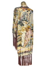 Made of beautiful burnout velvet devore on a sheer 100%silk background, the jacket is cut kimono-style with silky macramé fringe down the front, at the hem, and under the arms.