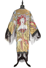 Made of beautiful burnout velvet devore on a sheer 100% silk background, the jacket is cut kimono-style with silky macramé fringe down the front, at the hem, and under the arms.