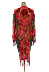The Art Deco Peacock Burnout Velvet Beaded Evening Kimono Jacket - Scarlet Red
