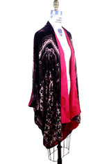 Constructed in batwing style, the jacket is made of a luxurious mocha brown and tan silk/rayon burnout velvet in a stunning vintage floral pattern. Lined in 100% red silk in a traditional Chinese brocade.