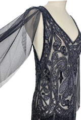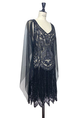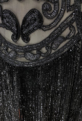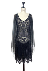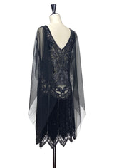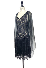 An effortless expression of 1920s Parisian evening style, The Bella Donna is intricately hand-beaded on sheer nylon mesh in a rich jet-black palette. Ornate Art Deco motifs contour the bodice before giving way to a softly scalloped hem.
