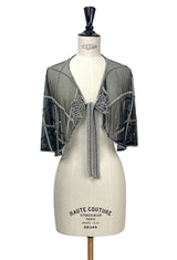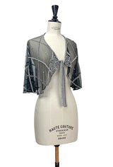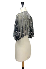 Delicate and dreamlike, The Maisie Capelet is inspired by an original vintage design from the Art Deco era. Handcrafted on soft black mesh, it shimmers with silver and pearl beading in a graceful grid pattern adorned with a floral accent.