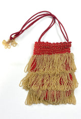 Our Bonbon Pochette is a love letter to craftsmanship—woven on a crochet base and adorned with cascading tiers of looped fringe. Lined in soft satin and finished with silk corded straps, each piece is finished with delicate beaded accents ~ pure vintage romance.