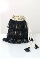 Our Bonbon Pochette is a love letter to craftsmanship—woven on a crochet base and adorned with cascading tiers of looped fringe. Lined in soft satin and finished with silk corded straps, each piece is finished with delicate beaded accents ~ pure vintage romance.