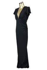 Constructed on a super sexy slinky evening nylon (a la 70's!), the gown features a maxi length, flutter sleeves, and incredible ruching overall. Sparkling rhinestones adorn the low-cut neckline.