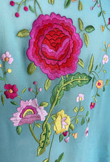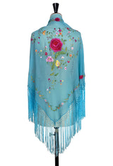 The 1920's Oriental Piano Silk Crepe Embroidered Triangle Shawl - Turquoise