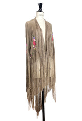 Intricately hand-embroidered, the jacket is cut kimono-style with silky macramé fringe down the front, at the hem, and under the arms. Full-length back.