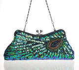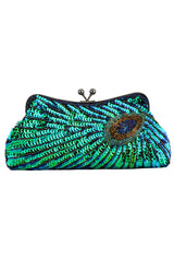 Handbeaded with a reproduction antique metallic frame and chain, the purse features a satin lining, bubble clasp, and an incredible blue/green beaded Art Deco peacock motif.