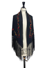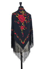 The 1920's Oriental Piano Silk Crepe Embroidered Triangle Shawl - Red Rose